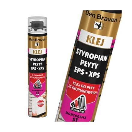 Klej DEN BRAVEN 750 ml do płyt styropianowych białych i grafitowych to jednoskładnikowy klej poliuretanowy do aplikacji przy pomocy pistoletu, do mocowania płyt izolacyjnych w systemach ociepleń.